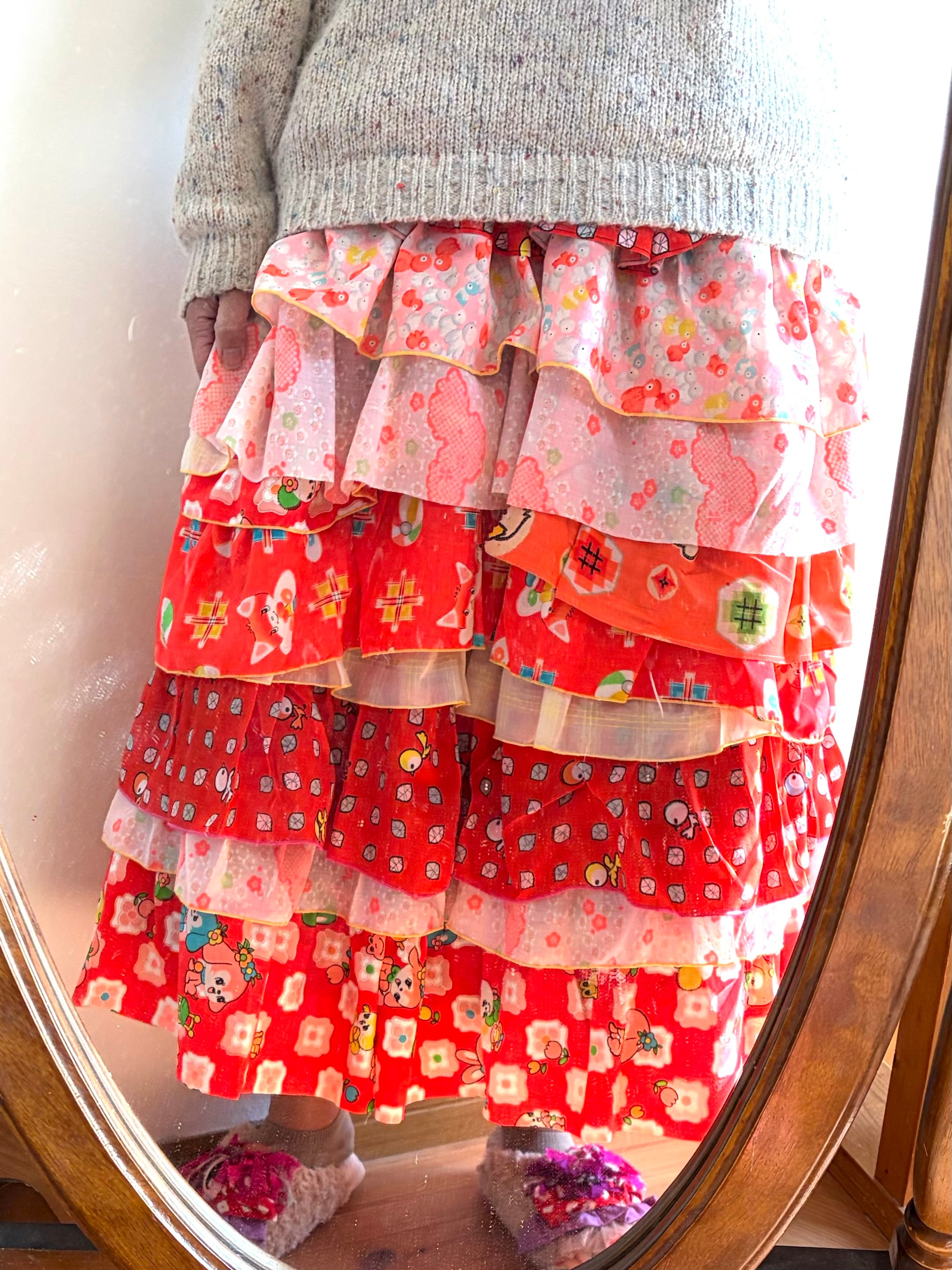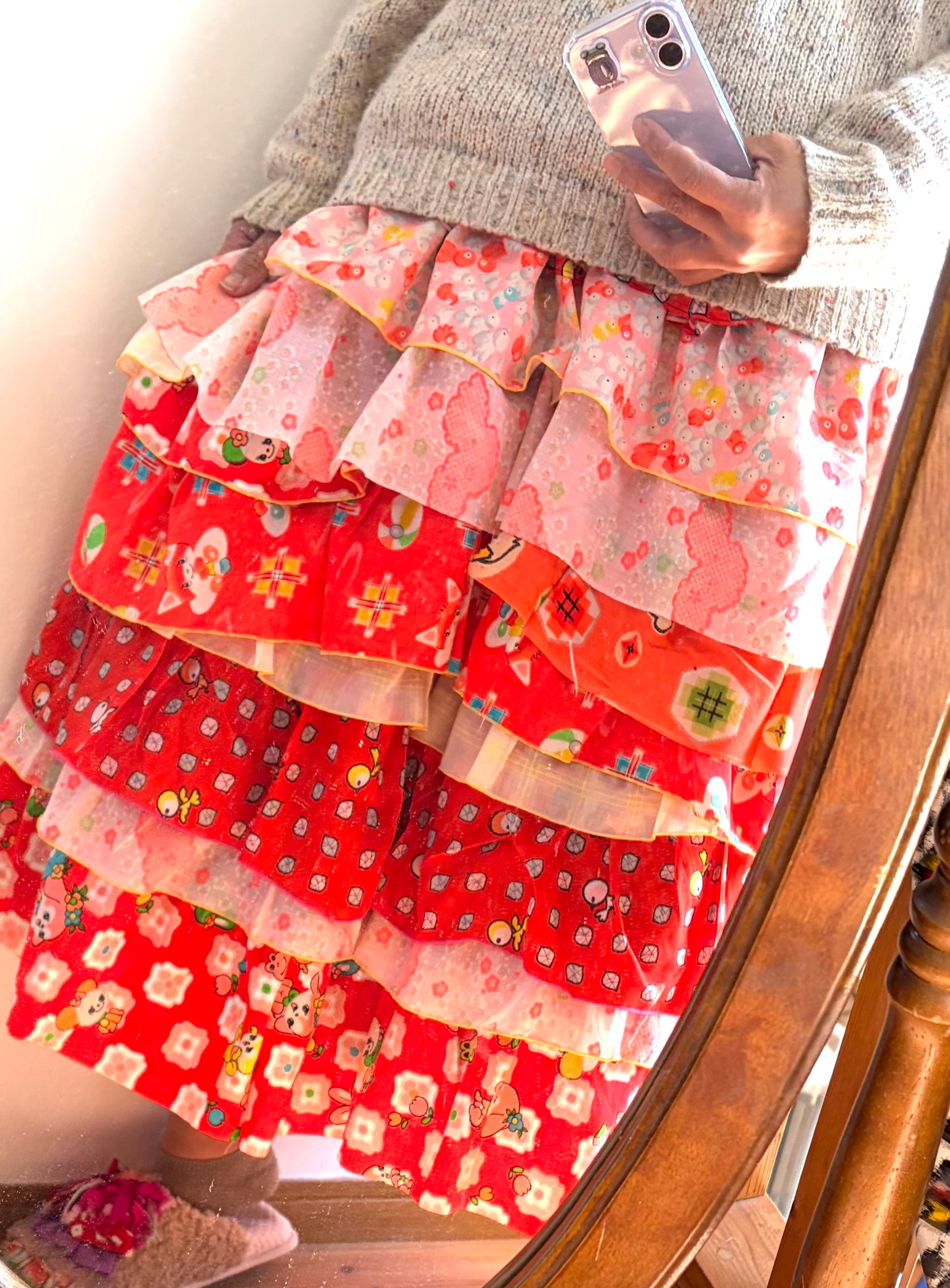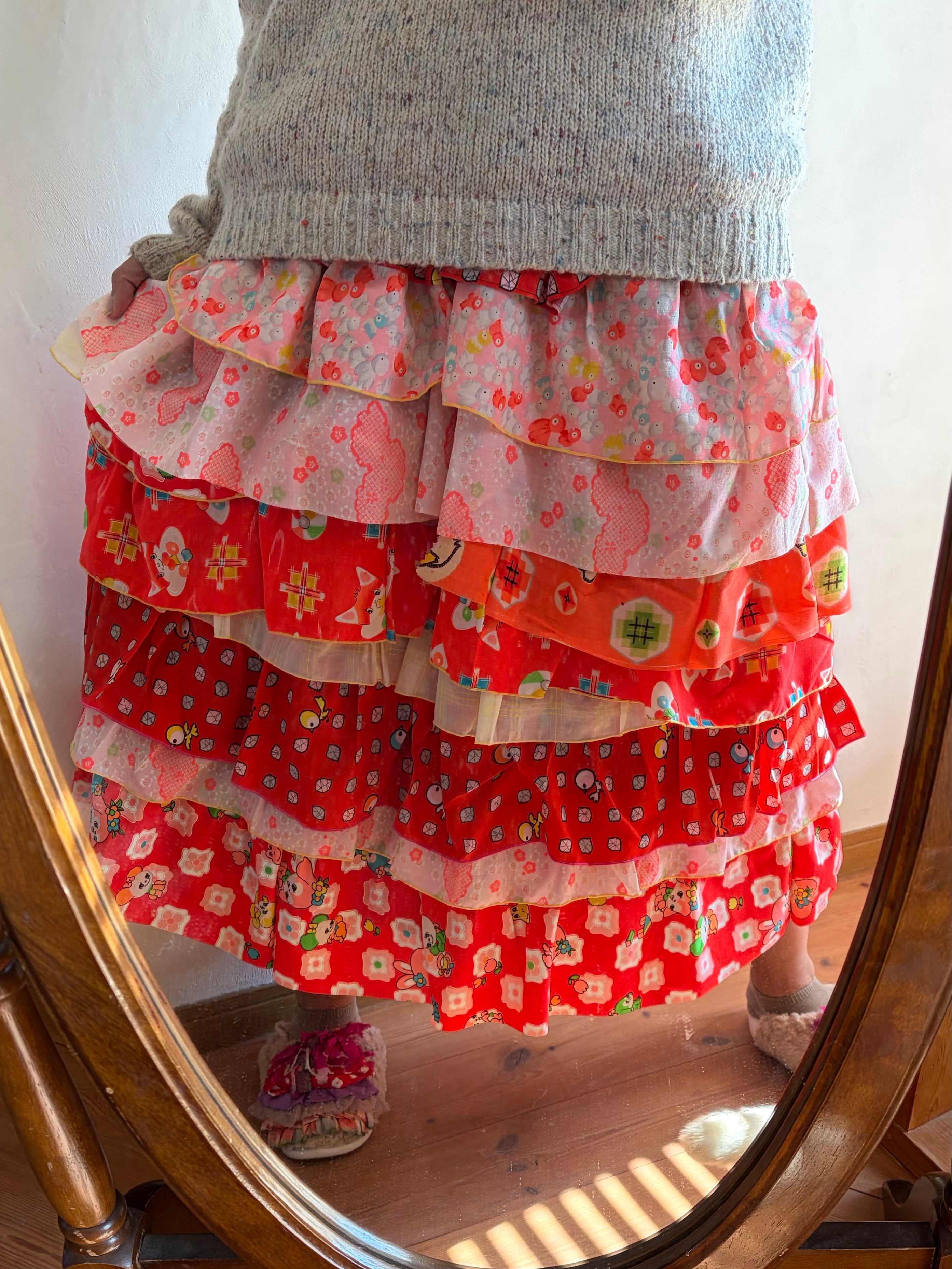 レトロな柄に総フリルが施された、ユニークなデザインのスカートです。古布を使用し、個性的な雰囲気を醸し出しつつも、日常のコーディネートに取り入れやすいシルエットに仕上げています。ふんわりとしたフリルが優雅に揺れるため、動くたびに表情が変わるのが魅力です。